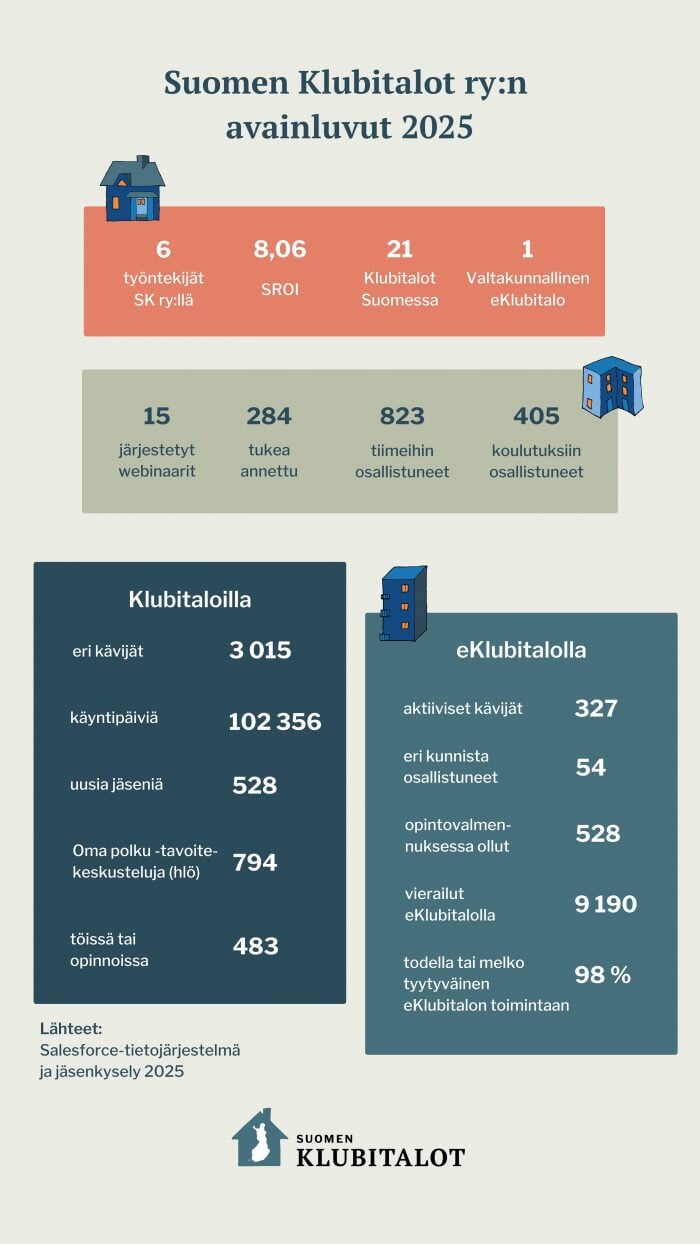 Vuonna 2025 Suomen Klubitalot ry muun muassa järjesti 15 webinaaria, antoi tukea 284 henkilölle ja järjesti tiimikokouksia, joihin osallistui 823 henkilöä. Suomessa on 21 Klubitaloa ja Klubitalojen työtä tukee valtakunnallinen eKlubitalo. Klubitaloilla kävi 2025 3 015 eri kävijää ja käyntipäiviä kertyi 102 356. Töissä tai opinnoissa kävi 483 jäsentä. eKlubitalolla vuonna 2025 aktiivisesti kävi 327 eri kävijää 54 eri paikkakunnalta. Vierailuja eKlubitalolla oli huimat 9 190. 98 % eKlubitalon kävijöistä oli todella tai melko tyytyväisiä eKlubitalon toimintaan. Lähteet: Salesforce-jäsentietojärjestelmä ja jäsenkysely 2025.